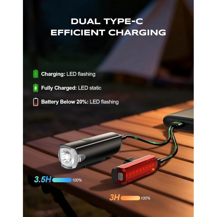 - LONG-LASTING & DUAL USB-C CHARGING: Equipped with a built-in 2600mAh high-capacity battery, the bicycle headlight lasts up to 6 hours (high mode) and 7 hours (low mode). The rear bike light can last for up to 430 hours with the 1200mAh rechargeable battery for prolonged safety. For added convenience, charge both lights at once with just one cable through the dual Type-C ports, no extra adapters needed.
