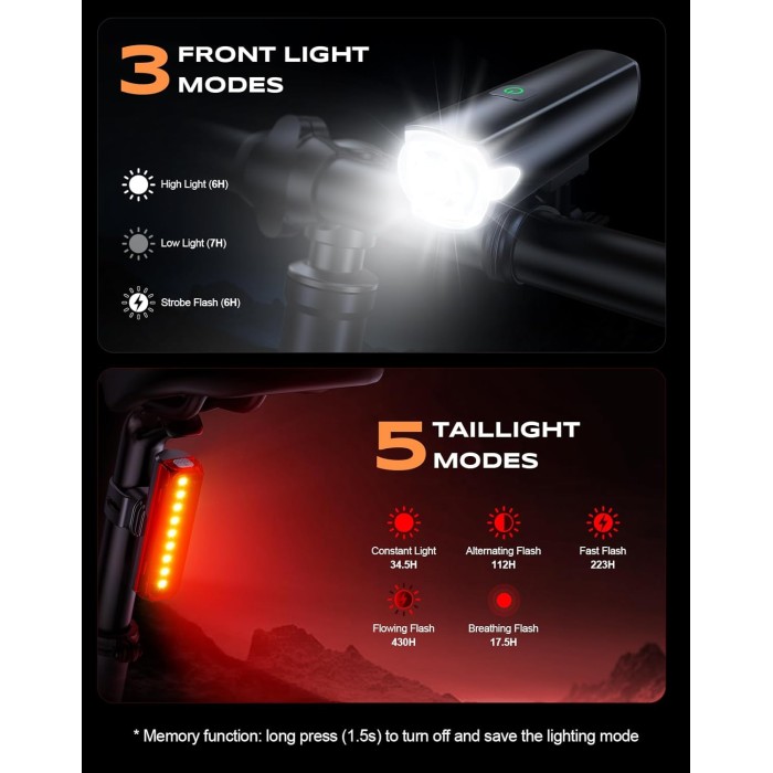 - SMART MODES FOR ANY RIDE: Easily adapt to any conditions. The bike headlight has 3 modes (High, Low, Strobe Flash) for perfect trail or road lighting. The bike tail light includes 5 modes (Constant Light, Alternating Flash, Fast Flash, Flowing Flash, Breathing Flash) to alert traffic effectively. Total 8 lighting combinations for day or night safety.