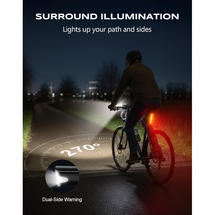 - ULTIMATE VISIBILITY & SAFETY: Move beyond standard beams. This bike light features a super-bright 1200 Lumen, enhanced by dual side-emission lenses and a sweeping 270° wide-angle beam that creates a cocoon of visibility. It brilliantly illuminates your forward path and curb, ensuring you are conspicuously seen from oblique angles, a critical defense at intersections.